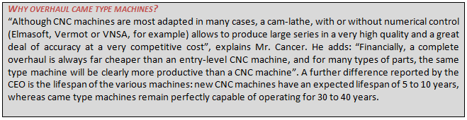 The company recently recruited a third scraping specialist as well as a young polymecanician to strengthen its various teams. One might think such skills are easy to find, yet Mr. Cancer describes a rather difficult task: “Scraper training no longer exists. We thus decided to hire a person with a Federal VET and to train him inhouse. As for the young polymecanician, he was interested in the wide variety of tasks and the ability to work both independently and as a member of a team”. Overhauling offers many opportunities and it is an expanding market. “At a certain time, every bar turning workshop seemed to want to work with CNC only and to give up cams. Today however, the process is reversed and many companies use again cam-type machines, which, while being more adapted to certain types of parts and series, offer the best price per unit”, adds Mr. Cancer.